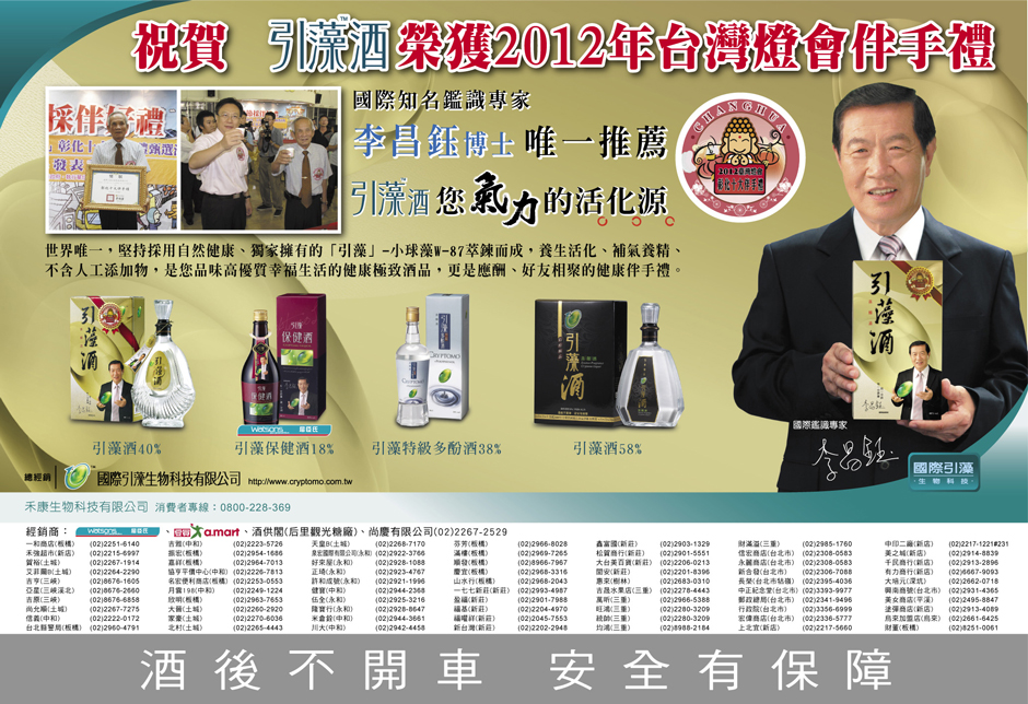 恭賀本公司40%引藻酒榮獲『2012台灣燈會彰化十大伴手禮』
