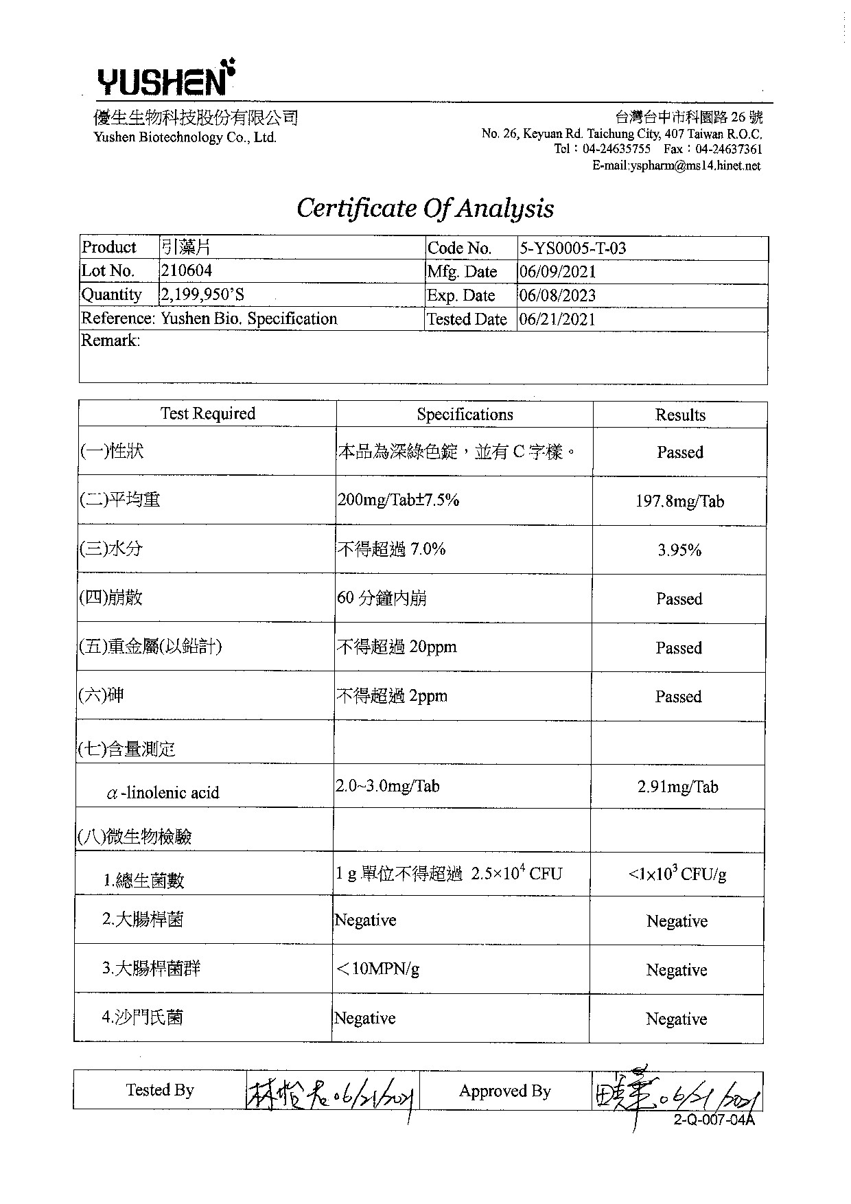 健康食品三認證引藻片檢驗報告(LOT.:210604)